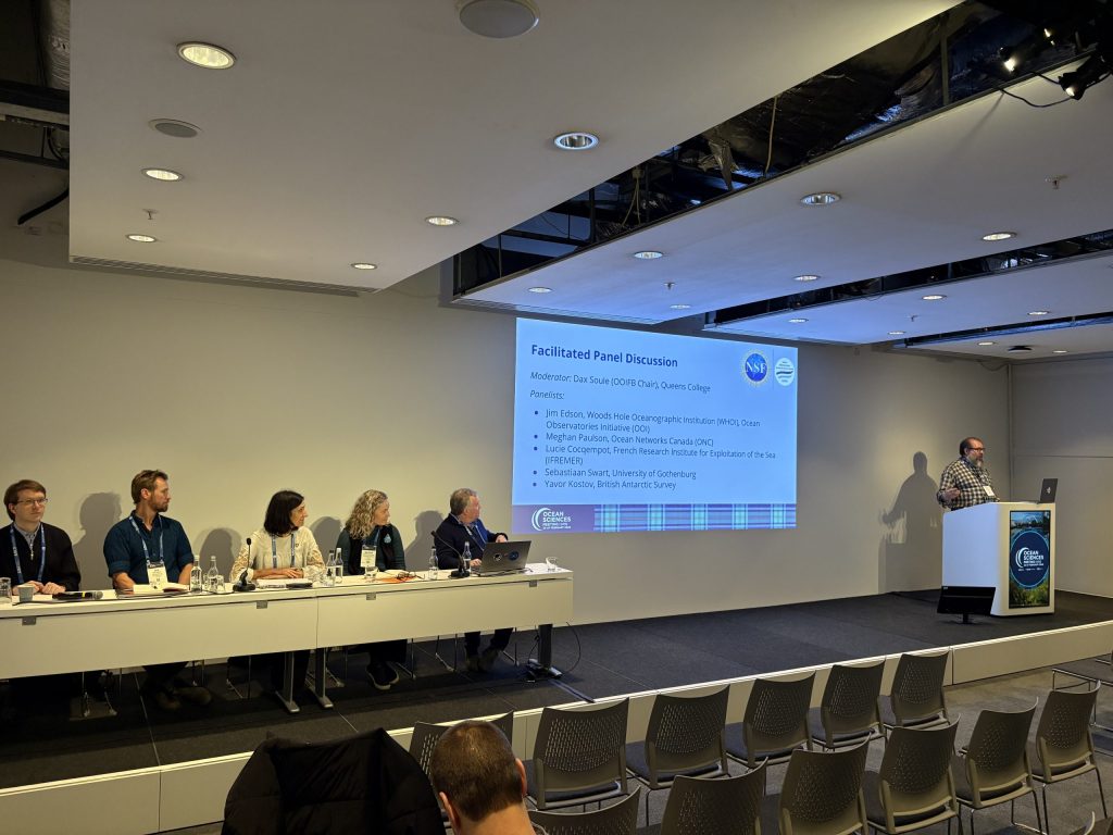 The discussion was moderated by Dax Soule (OOIFB Chair) and featured panelists from organizations including the Ocean Observatories Initiative (OOI), Ocean Networks Canada (ONC), IFREMER, the University of Gothenburg, and the British Antarctic Survey.