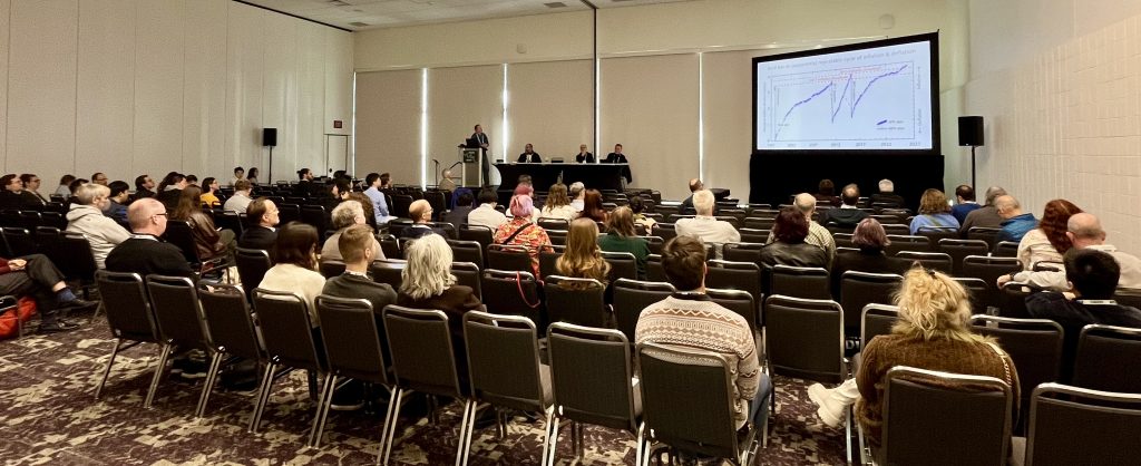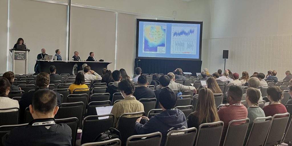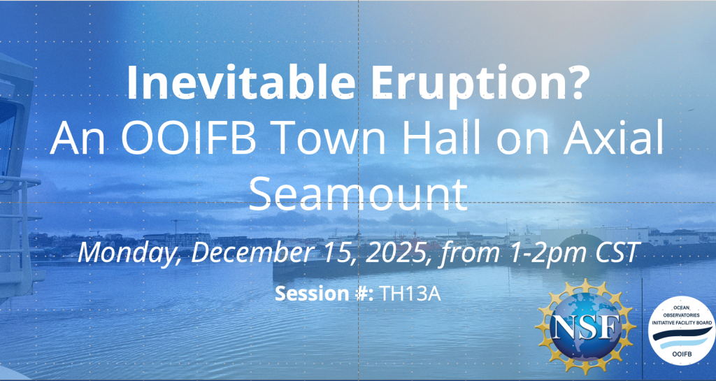 The OOIFB hosted a successful Town Hall event at the 2025 American Geophysical Union (AGU) Conference in New Orleans, LA. The Town Hall took place on Monday, December 15, 2025, from 1-2pm CST, with over 85 scientists, students, resource managers, educators and others in attendance to discuss recent research discoveries and the status of Axial Seamount in the Northeast Pacific. Axial Seamount, an underwater volcano located ~300 miles off the Oregon coast, is the most active submarine volcano in the NE Pacific and is displaying behavior indicative of an impending eruption. The Ocean Observatories Initiative’s (OOI) Regional Cabled Array, funded by the U.S. National Science Foundation (NSF), hosts over 20 multidisciplinary cabled instruments at Axial and provides real-time monitoring, which will illuminate key processes before, during, and after this eruption. Co-registered measurements of earthquakes, seafloor deformation, and hydrothermal activity are key to understanding mid-ocean ridges that form the largest mountain chain on Earth.
